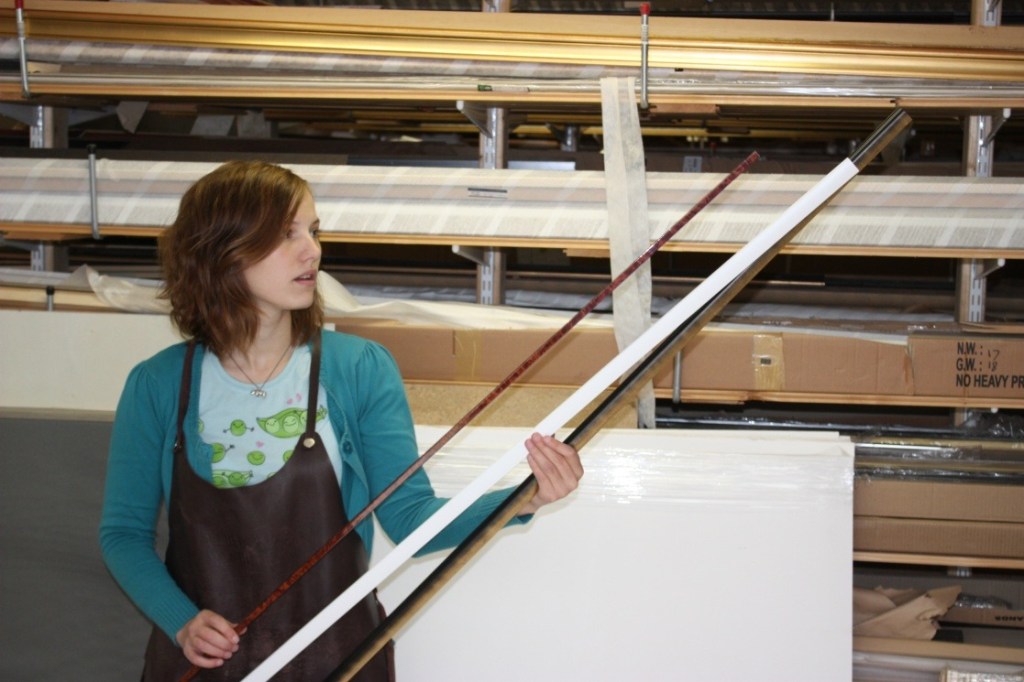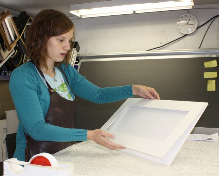 Passepartout skjæres med en datastyrt passepartoutskjærer. Den skråskjæres, slik at lyset kommer best inn på bildet.