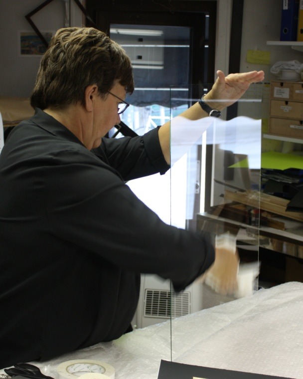 Bildet hengsles fast med syrefrie tape på to punkter øverst. Det er viktig at monteringen er reversibel.